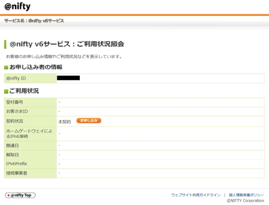 「@nifty v6サービス」をお申し込みされていない場合、以下の画面が表示されます。